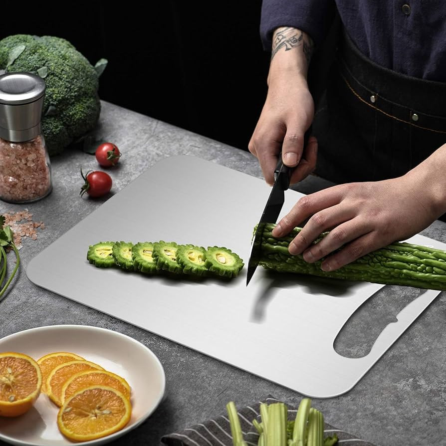 Titanium is a premium-grade metal renowned for its lightweight strength, rust resistance, and antibacterial properties. It’s commonly used in aerospace, surgical tools, and high-end cookware — and now, in kitchen cutting boards.